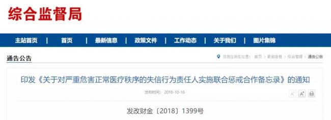 2018年10月,国家发展改革委、国家卫生健康委等28部门联合印发了《关于对严重危害正常医疗秩序的失信行为责任人实施联合惩戒合作备忘录》,明确规定: